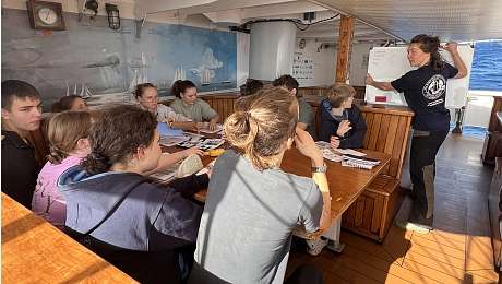 Beitragsbild: Lehrerin Lilly hält das Whiteboard beim Spanischunterricht an Deck © Vici