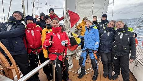 Erlöst wurden wir dann nach sechs Tagen voll harter Arbeit und Übelkeit. Wir durften endlich richtig Watch an Deck machen. Mit Marie als Watchleaderin in der 8 – 12 Watch erlernten wir die Basics des Segelns auf der Eendracht. Schon bald wurde es Zeit für unsere erste Wende. Und was einen nicht umbringt, macht bekanntlich nur stärker. Der Härtetest in der Galley hatte uns ordentlich zusammengeschweißt. So wendeten wir das erste Mal und unser Team bekam vom Captain die Rückmeldung, es wäre eine Wende wie aus dem Bilderbuch gewesen. Als der Wachwechsel anstand und wir uns damit neben Marie auch von unserem Offizier Antoon verabschieden mussten, hisste er die Bravo-Zulo-Flaggen-Kombination für uns. Diese Anordnung bedeutet so viel wie „sehr gut gemacht“.