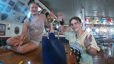 Extra für diesen Blog* habe ich mir letztens auch mal die Mühe gemacht und ausgetestet, bei wie viel Grad Neigung ein mit Wasser gefüllter Plastikbecher, der auf einem Specklappen steht, umkippt. Da wir zur Zeit des Experiments vor Anker waren, habe ich die Neigung des Schiffes mit einem Blech aus der Galley simuliert. Was bei dem Experiment rauskam war, dass der Becher bei einer Neigung von etwas mehr als 27° umkippt. Da ich mir nicht sicher bin, ob das Schiff wirklich schon mal 27° Neigung hatte, jedoch schon sehr oft Becher bei Seegang umgefallen sind, vermute ich, dass sich das Schiff manchmal mit so viel Schwung bewegt, wodurch die Becher schon früher, als erst bei 27°, umkippen.