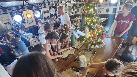 Paul: Ganz liebe Grüße vom Atlantik nach Hause, Oma und Opa und an alle aus der Schule und Kleinostheim! Ich wünsche euch ein frohes und gesegnetes Weihnachtsfest voller Freude, tollen Geschenken und etwas mehr Plätzchen und Weihnachtsstimmung als bei uns an Bord. Mir fehlen etwas die kalten und ekligen Temperaturen, während wir hier in T-Shirt und kurzer Hose auf Nachtwachen sind (~27°C); aber natürlich macht hier alles mega viel Spaß und ich habe hier eine stressfreie und glückliche Zeit. Um auf dem Wasser etwas Tradition reinzubringen, veranstalten wir ein Krippenspiel und einen Gottesdienst. Frohe Weihnachten!