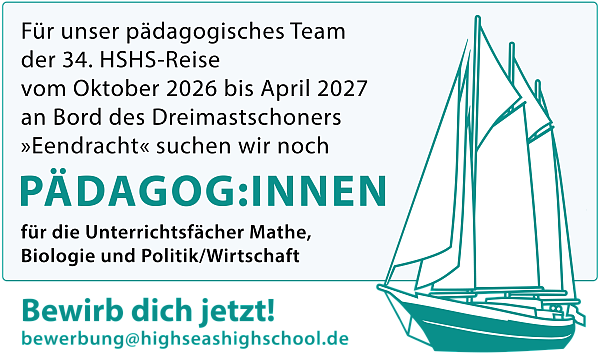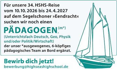 Der »Crew an Land e.V.« ist der Verein für alle Altfahrer:innen, Freund:innen und Förder:innen der HSHS. Er wurde 2010 von ehemaligen Teilnehmerinnen und Teilnehmern verschiedener HSHS-Törns gegründet. Ziel unserer ehrenamtlichen Arbeit ist es, ein Netzwerk aus Ehemaligen und Gleichgesinnten zu bilden, neuen Schüler:innen mit Teilstipendien eine Teilnahme zu ermöglichen und das Projekt aktiv mitzugestalten.