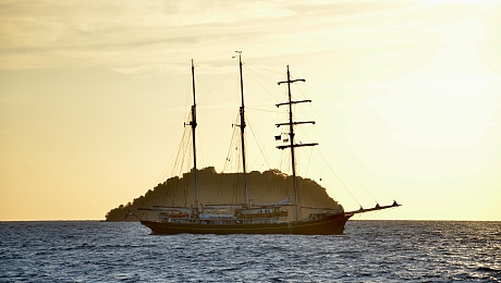 St. Lucia: Wir können wegen zu viel Wind nicht ankern. Deshalb hat die Crew der Gulden Leeuw uns an Land gebracht und »floated« nun, bis wir wieder da sind. © Vici
